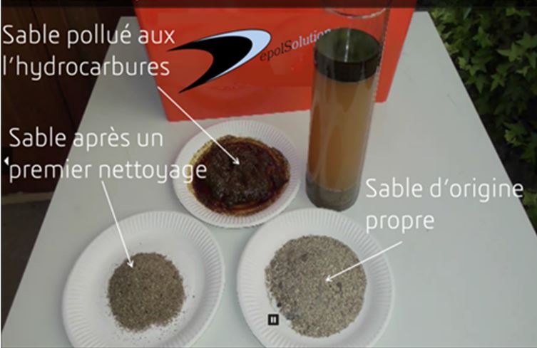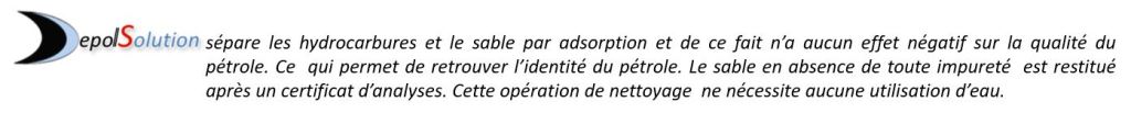 Le sable et le pétrole sont mis dans un bain de DpS1. Après traitement de quelques minutes, l’ensemble est versé dans une cuve de décantation.